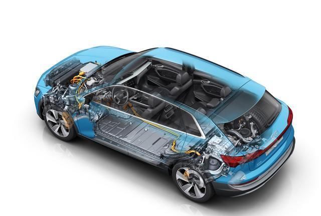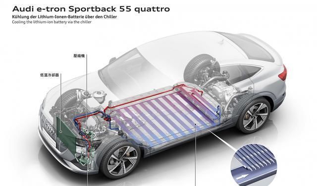 奥迪etron50quattro和55quattro搭载水冷大容量锂电池组,可分别存储71kWh(50quattro)和95kWh(55quattro)总功率,并配备先进的热管理系统,大幅提升整体充电效率.该系统可根据车辆行驶时电池模块持续供应电能的情况,根据低速行驶、高速或剧烈行驶等不同负载情况,提供不同程度的冷却需求。冷却器用于冷却电池和充电器。如果需要更高的冷却需求,系统将通过冷却器快速冷却。整个冷却回路的管道总长度为40米,四个冷却回路(内部共装有22升冷却液)确保奥迪etron的电芯模块即使在高应力水平或低温。也可保持在25至35摄氏度的最佳范围内。