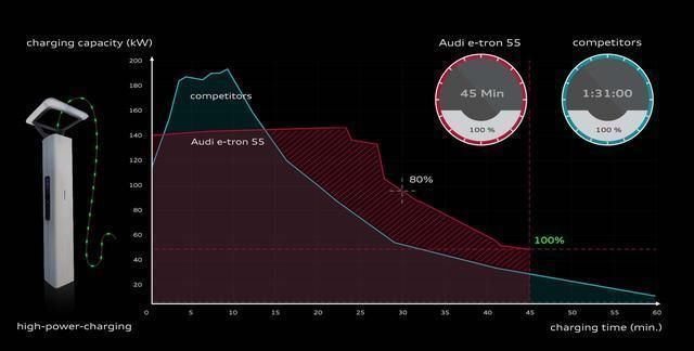 在理想条件下,在智能充电管理系统开始降低电流之前,大多数电动汽车会在最大输出功率状态下进行充电。然而,这些充电系统通常仅限于在很短的时间内达到最大输出。功率方面,奥迪etron高效充电系统的主要区别在于,在充电容量达到70%阈值之前,系统会大幅降低其输出功率;这一特性为汽车的日常使用提供了显着优势,通过奥迪快速充电站的直流大功率充电服务仅需充电10分钟,其续航里程可行驶约115公里,仅需约30分钟从 0% 充电到 80%。整个充电过程约45分钟即可充满。 ,不仅为奥迪etron提供了稳定高效的高原充电曲线,而且可以覆盖大部分充电过程,充电功率高达150kW,大大减少了充电所需的时间;这些充电技术的优势,为日本的奥迪etron提供了在普通车辆上使用时带来极佳的实用性和便利性,让长途旅行中充电站的规划更加灵活。