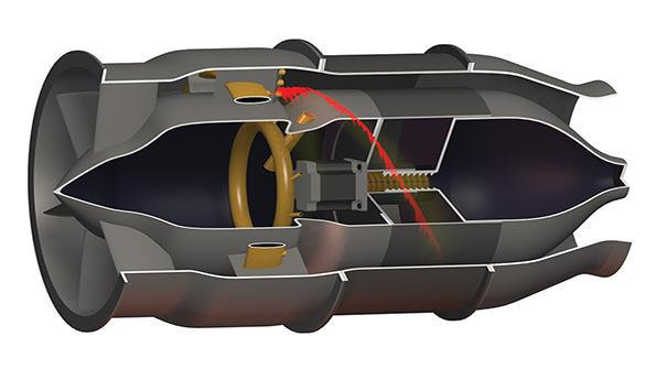 (图解:空气从旋转爆震发动机的进口进入,通过隔离器时与连续、循环注入并在爆震环处被点燃的燃料混合。爆震波阵面概念图用红色表示。图源:aviationweek)